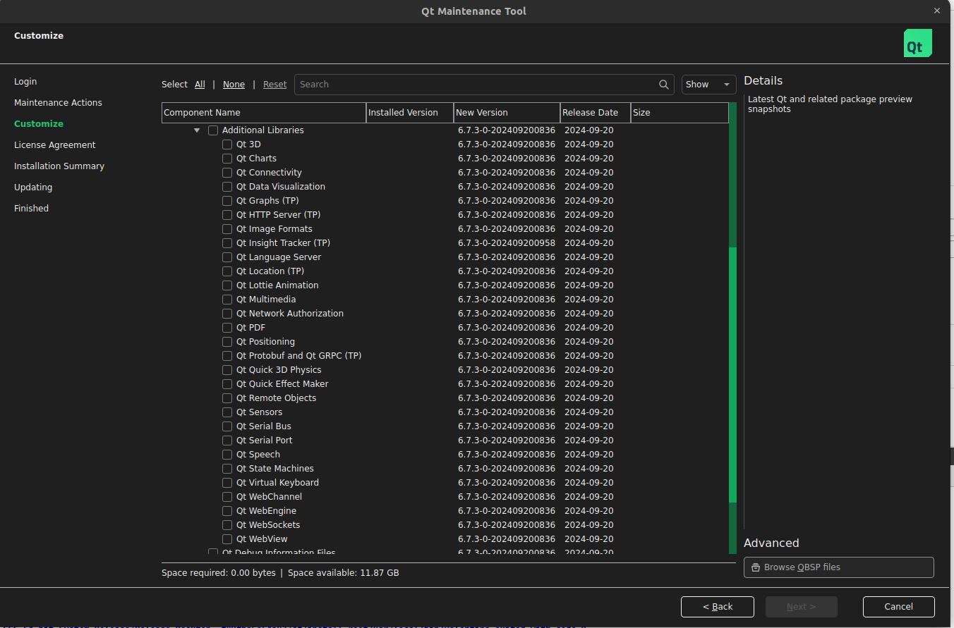 Don’t know for sure… can’t see the list of the Additional Libraries. But yes… other than the Desktop, Qt5 compat module, and the whatever in the Additional Libraries you don’t need any of the other stuff… especially the Souces code as that’s huge. Possibly might need the Debug information to run a debugger in Cretator.