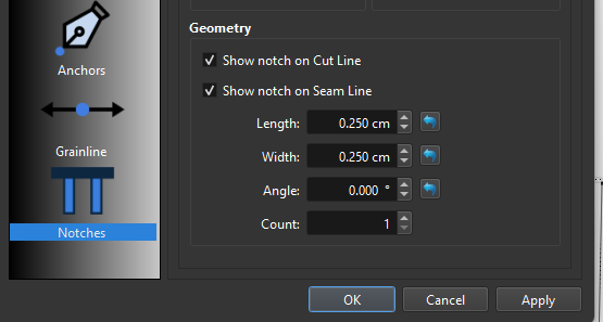 I have been having issues with notches on ‘Pieces’. Initially when I created a new ‘Piece’ from Draft, and having placed Notches as below: