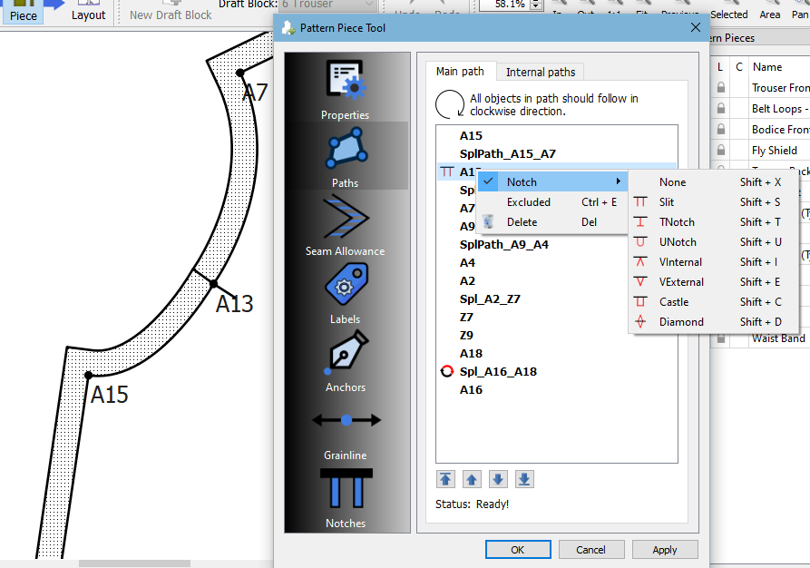 Option is non finctional at this time. Previous dev just duplicated the pattern piece dialog for the internal paths, and never removed the notches from it. We would have to resolve the issue of which side of the path the notch is on before we can implement notches on IPaths. For the main path it’s easy, as the notches are always on the inside.