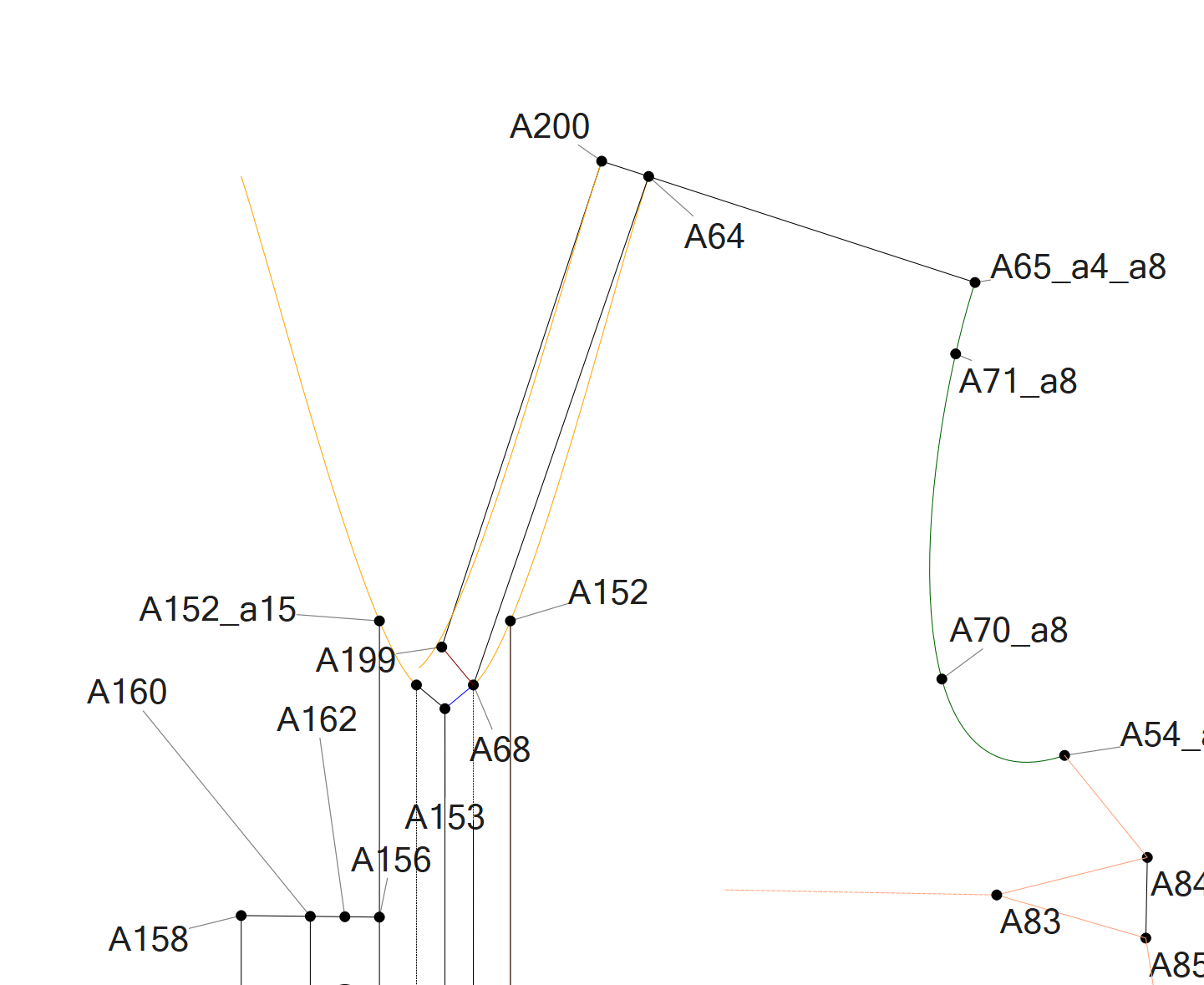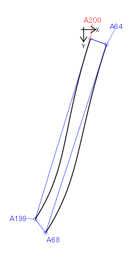 This way, if the size changes, then the angles A64_A200 & A68_A199 may change, and the distances between A64_A68 & A199_A200 will also change, so you will be utilizing both in both formulas equally, so it should resize smoothly and keep the 2 curves very similar in perspective.