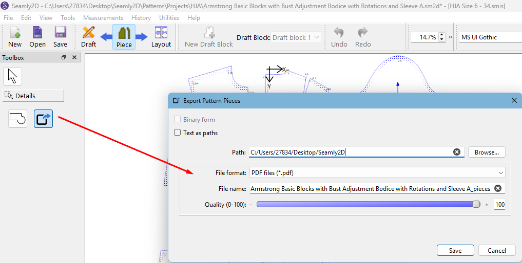 Then, in Piece Mode, you can directly export the pattern to PDF: