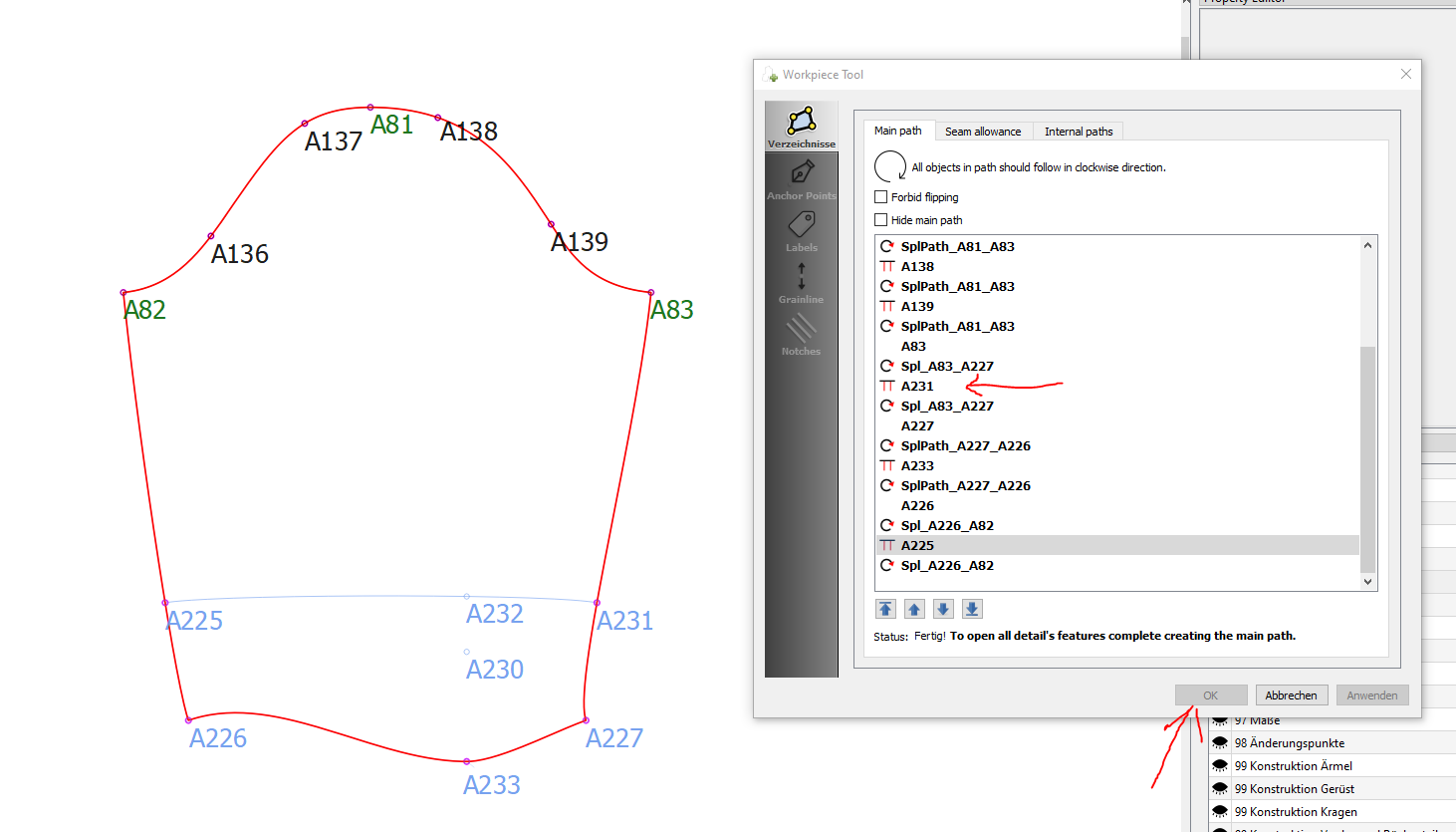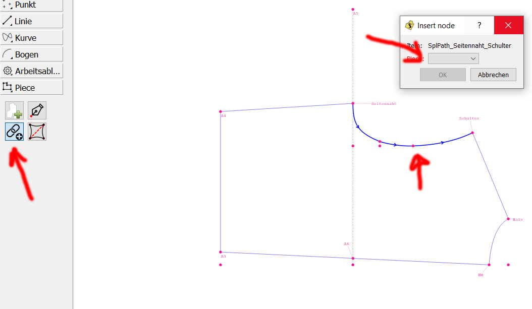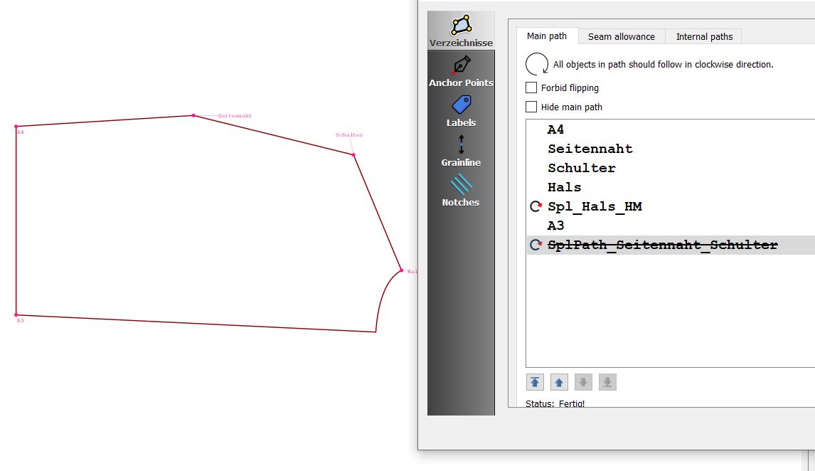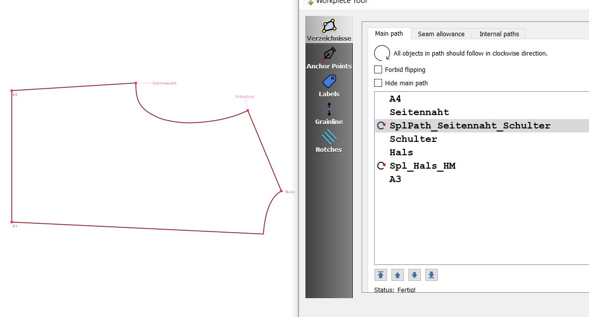 Im Insert node kann ich “Pattern Piece” auswählen, hab aber dann keinen Plan wie ich dann wieder ins Linienverzeichnis komme. Und es geht nicht nur um eine Kurve, es werden alle vier nicht erkannt. Hab wirklich jeden verfügbaren Punkt als Start verwendet, und die Uhrzeigerrichtung eingehalten. Ironischer Weise funktionierte es einmal gegen den Uhrzeiger, wurde dann natürlich im Linien-Verzeichnis nicht anerkannt.