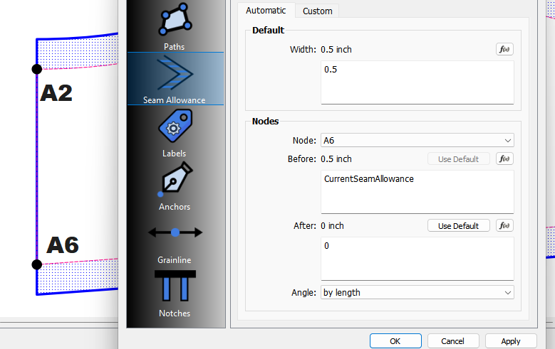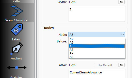 To expand on that… each Node point has a Before and and After SA (Seam Allowance)… in a clockwise direction. For ex: Point A6 here has a Before SA of .5 and an Aferr SA of 0:… while A2 will have a Before SA of 0, and and After SA of .5. So the SA between A6 and a2 is 0 - such as a fold line.