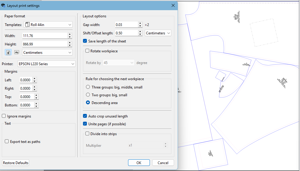 Once you click on OK, it will ask you something about the margins settings, just click on yes to keep the current Margin settings. Select different roll paper settings until you get the pattern pieces quite compact on the sheet. I normally start with the widest and work my way down depending on the size of the pattern.