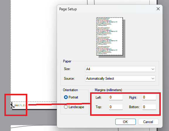 Click on “Page Setup” and change the paper to A4, leave it at Portrate and set the Margins to 0.25cm, click on OK: