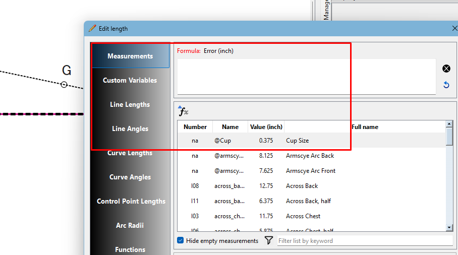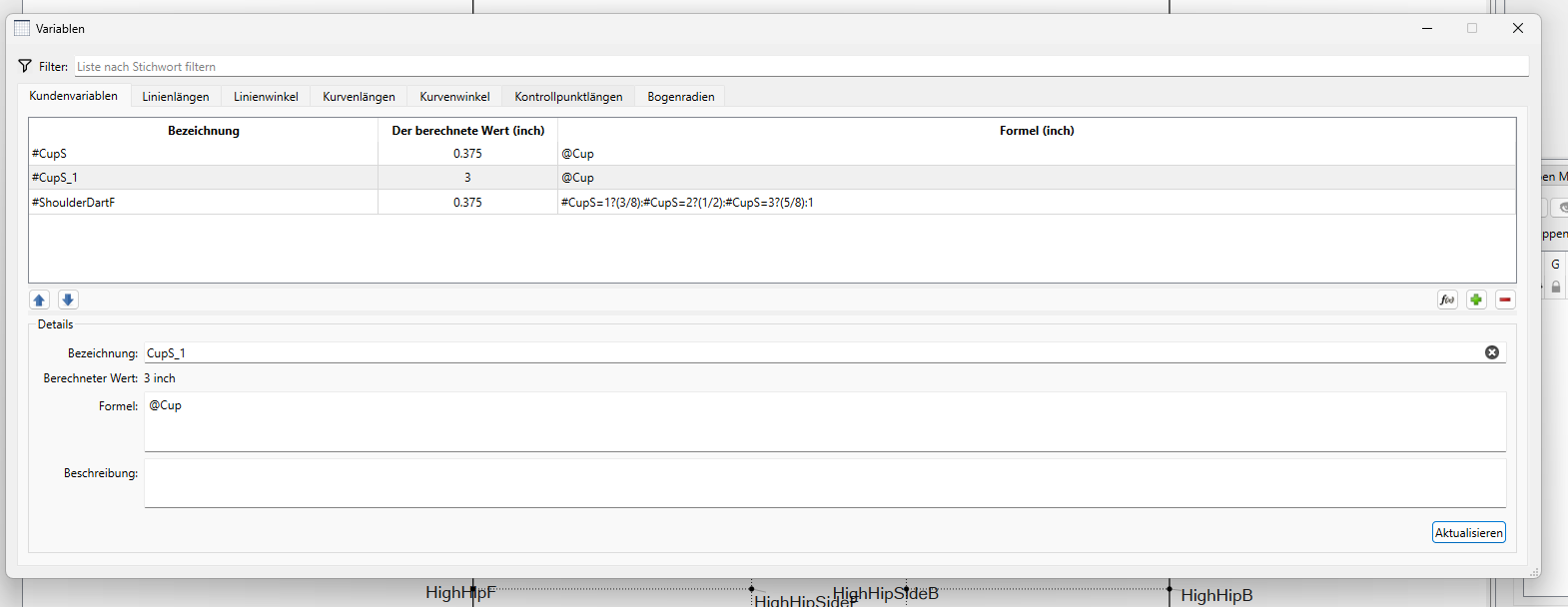 Next, I made a Custtom Variable that references this Custom Measurement for the Shoulder dart width, which didn’t work, so I made another Custom Variable to get the Custom Measurement value, so that I didn’t need to keep opening the measurements file & triggering the Sync and moved it above the previous one and edited the formula of the shoulder dart to reference this CupS variable.