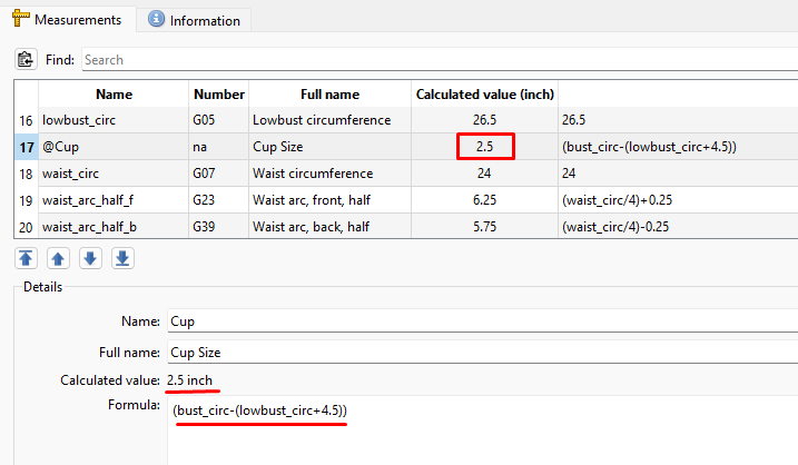 Firstly, in the measurements file, I have a formula for the cup size: rint(bust_circ-(lowbust_circ+4.5)) which returns a value of 3.