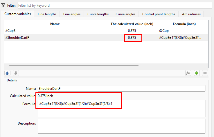 Here is my ShoulderDart formula: #CupS=1?(3/8):#CupS=2?(1/2):#CupS=3?(5/8):1 - The idea here is to return a value of 0.625 for the 3 cup size, but it’s returning a value of 0.375, so I think I’ve made some mistake here that I’m not seeing. ![]()