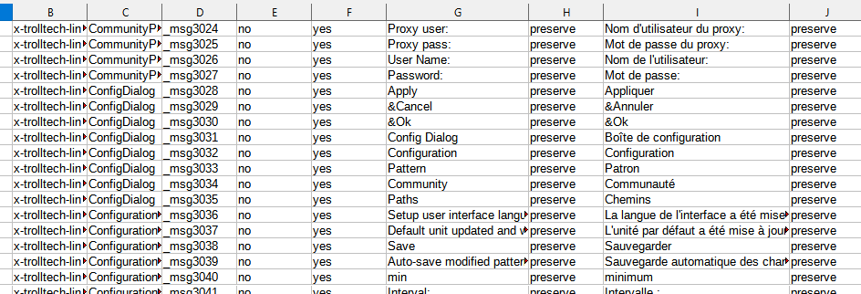 That being said… I would think the fields (columns) required should be Context, Source, Translation, Dev comment, Translator comment. The context is the group that a text is in… For ex: the Move dialog… the context would be “Move” and contain all the text items in that dialog. The dev comment would be comments by developers - such as avoid using math symbols or spaces in translation. The translation comment is for comments to help the translator. trans
