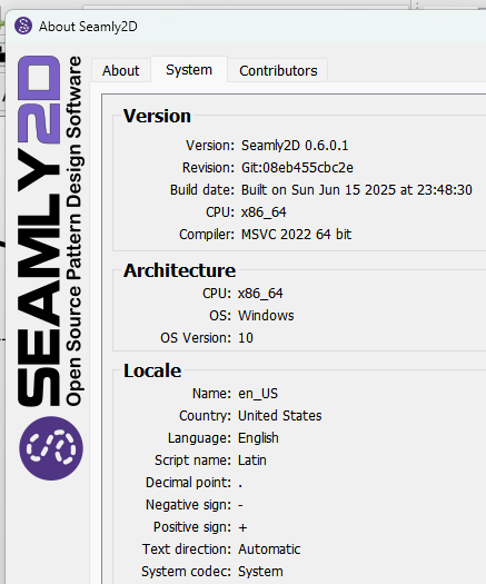 Seamly2D version: Seamly2D 2025.6.16.216 Build revision: Git:280a664dd3ba Build date: Built on Mon Jun 16 2025 at 02:24:44 Qt Version: 5.15.2 CPU: x86_64 Compiler: Clang 14.0 (Apple) 64 bit CPU: x86_64 OS: macOS OS Version: 13.7 Locale: en_GB Country: United Kingdom Language: English Script Name: Latin Decimal Point: . Negative Sign: - Positive Sign: + Direction: Automatic System Codec: UTF-8 Arguments: /Applications/Seamly2D.app/Contents/MacOS/Seamly2D