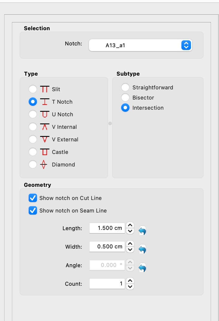 The count only applies to straight forward notches, and is limited to 1, 2, or 3⌠which in patterns relates to front, side, and back. For ex: The front half of a sleeve cap and arm hole will have a single notch, and the back half a double notch. The triple notch will usually be found on the center back seam of muilti paneled skirts.