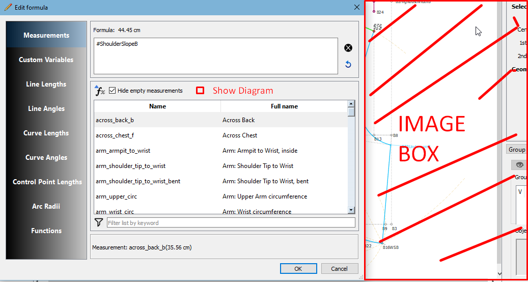 I also thought of having the diagram image popup when you hover over a measurement number. Wouldn’t require any addional buttons or space in the dialog.