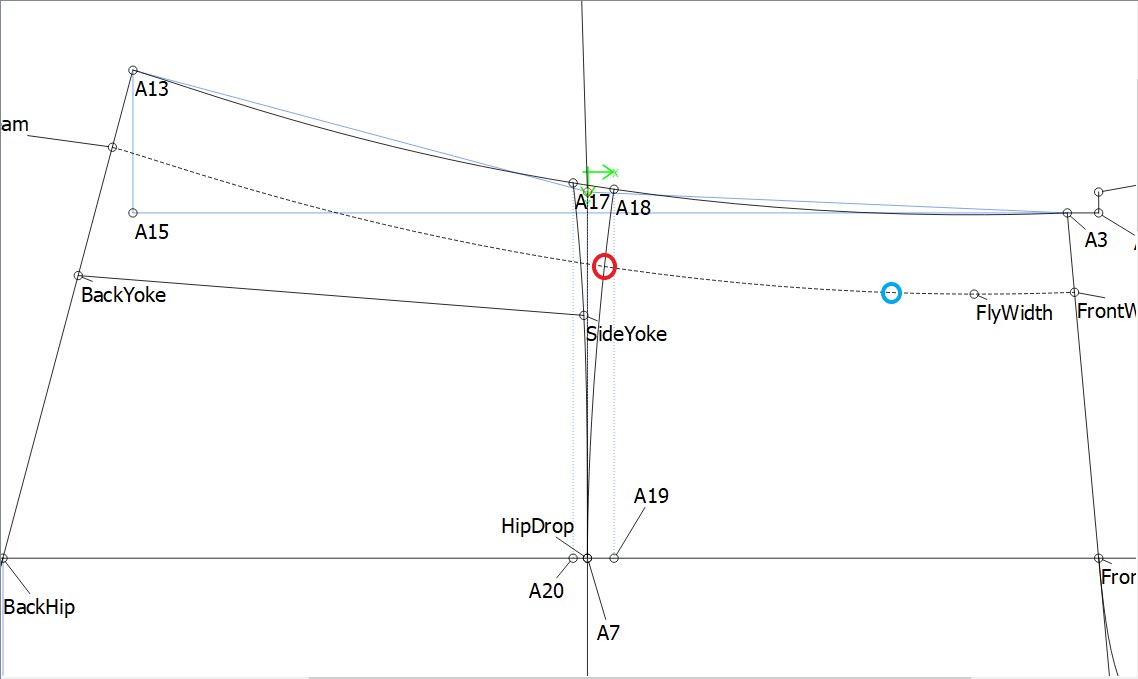 I’m working on a men’s selvedge jeans draft and I’ve encountered a problem. I need to make a point where the outseam and bottom of the waistband seam intersect, circled in red. I then need to add a point along the bottom waistband curve at a specified distance from the point in red to mark the location of the pocket facing, circled in blue. I know how to add the point in red, but I can’t reference that point when trying to segment that curve for the point in blue.