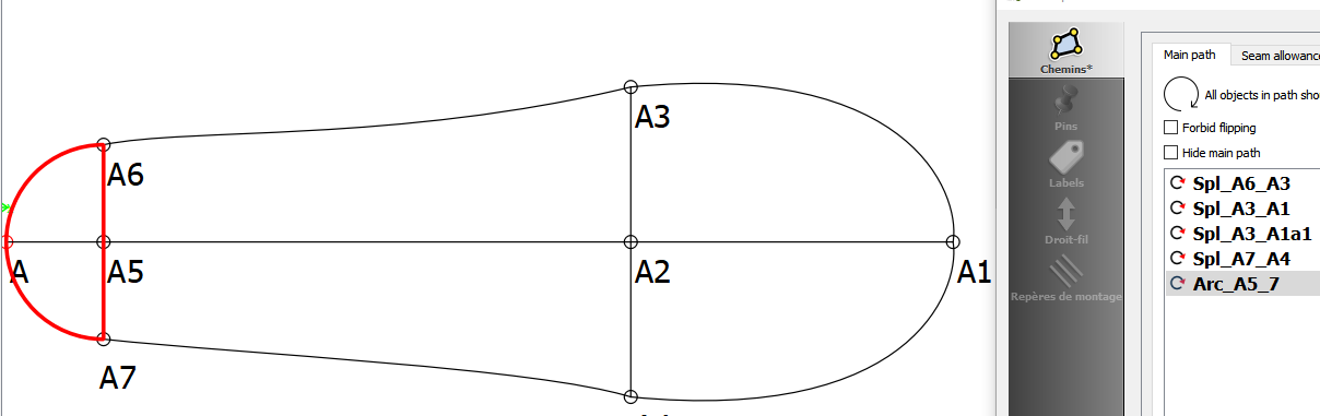 Quand j’ai créé ma pièce j’ai commencé par la courbe A6/A3 dans le bon sens, puis A3/A1 toujours dans le bon sens, ensuite A1/A4 en appuyant sur shift, puis A4/A7 encore avec shift, puis enfin l’arc A7/A6 également avec shift. Et voilà ce que ça donne. In compréhensible pour ma petite tête. J’ai essayé en partant d’autre point mais rien à faire je n’y arrive pas et pourtant ça semble simple. Voici mon fichier Bottines Morgane.val (8,1 Ko) sans fichier mesure Merci pour votre aide