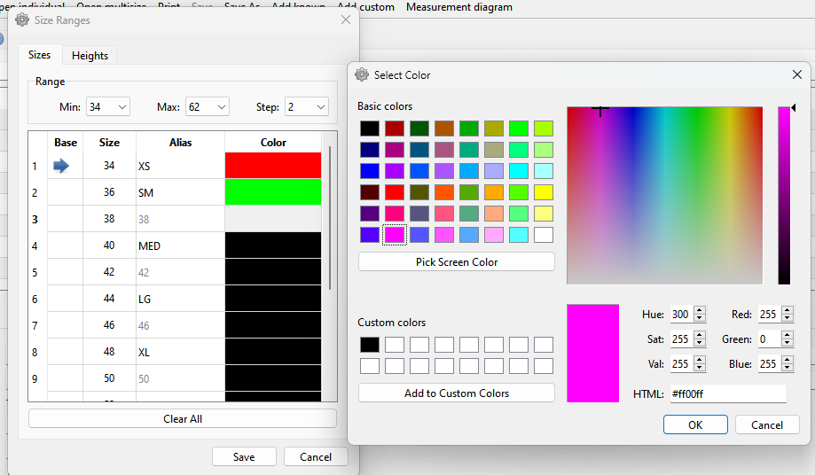 I’ve been working on cleaning up & integrating the BF’s code into SeamlyMe… here’s a WIP sneek peak to an updated “Size Ranges” dialog with the addition of a size “step”, a base size/height selector, and a size color column (for future nesting use) with the color selector: