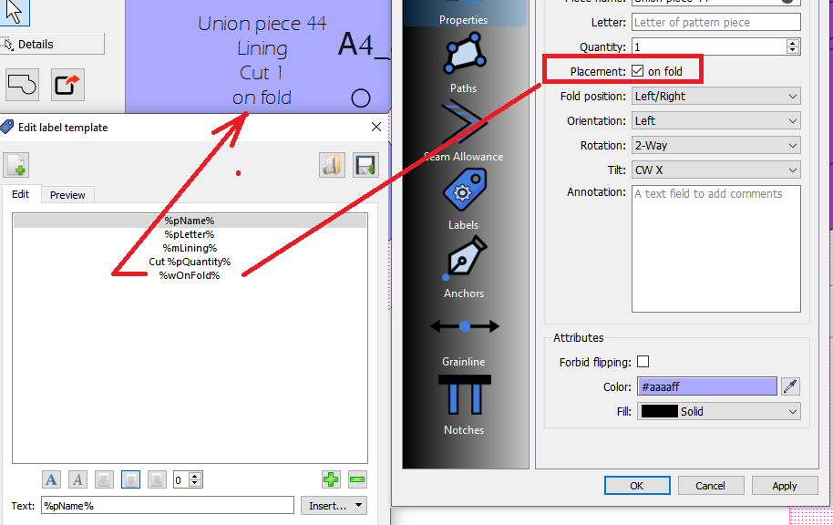 This is another one of those what does it really do legacy features. It’s really only for the piece label data… so it will show in the label On Fold if checked. I’m just finishing up overhauling the Pattern Piece tool and dialog, so it’s more organized as to what’s going on. I’ll post some screencaps when I get a chance.