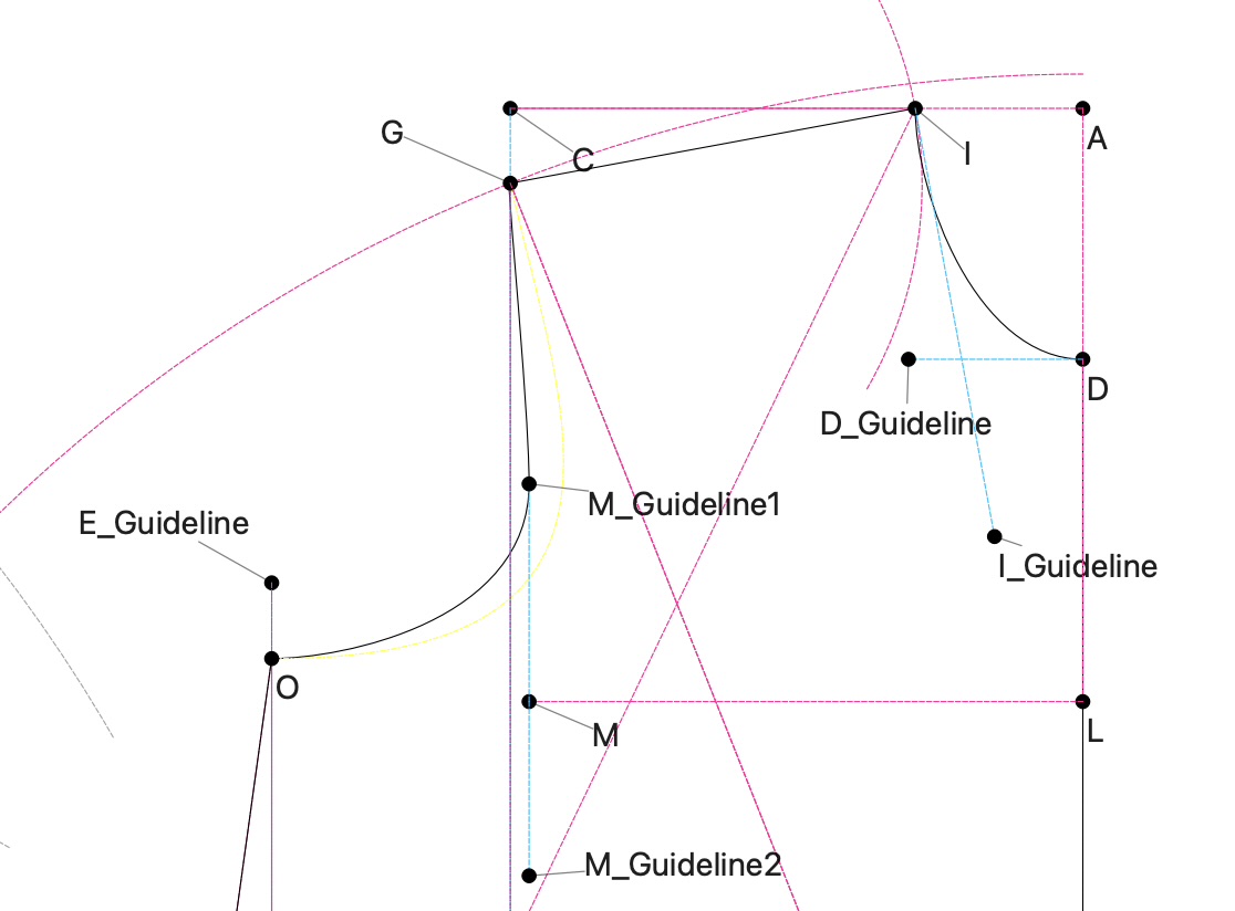 On the front bodice, my across chest point (M) doesn’t intersect the arm curve. Is this normal? I tried adding a vertical guideline up from the across chest point (M_Guideline1) but the length is hard coded arbitrarily. Do you see what I’m doing wrong on the bodice in general for my across chest to be like this or is a technique on how to achieve a good arm curve in this instance? (The yellow guide is something I tried but can’t delete.)