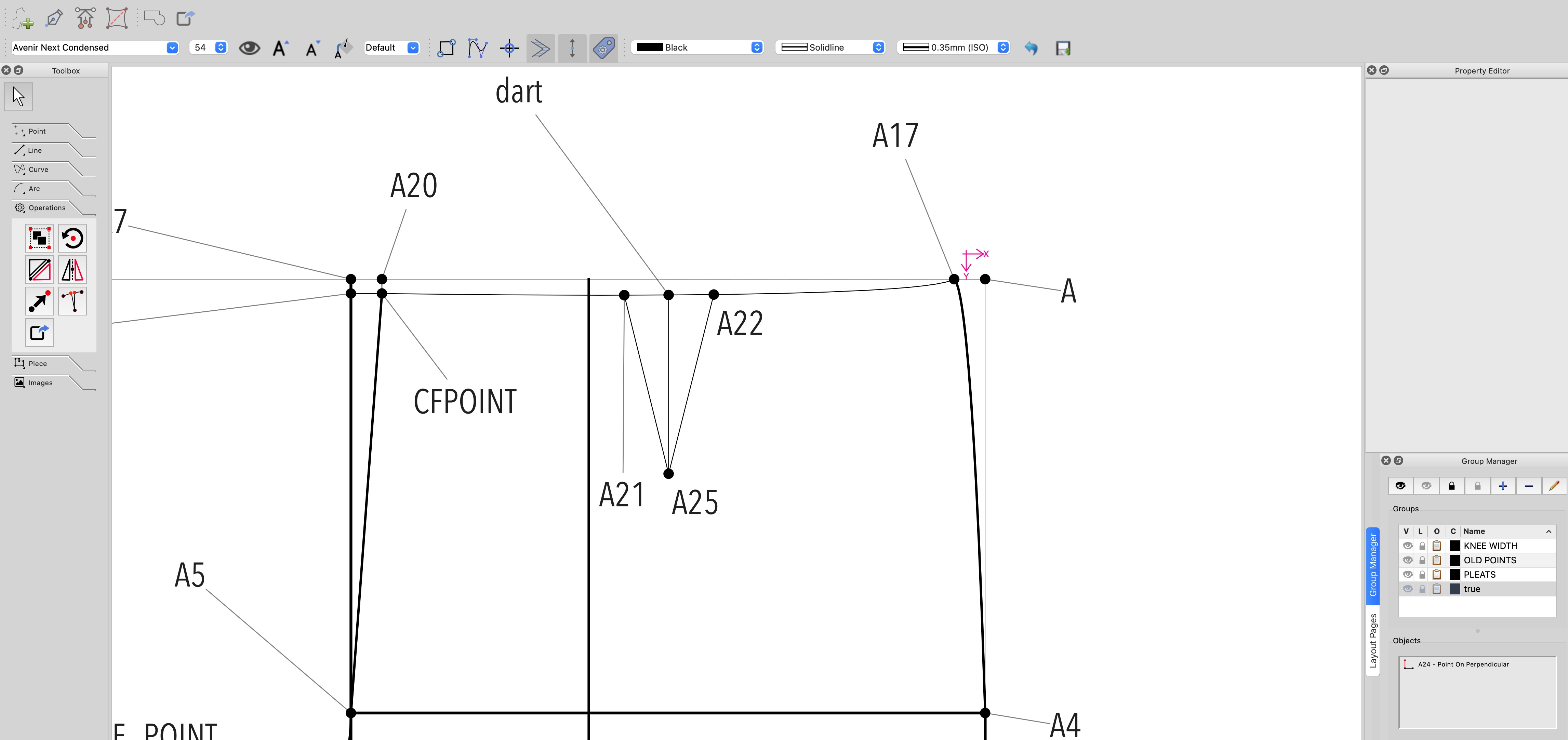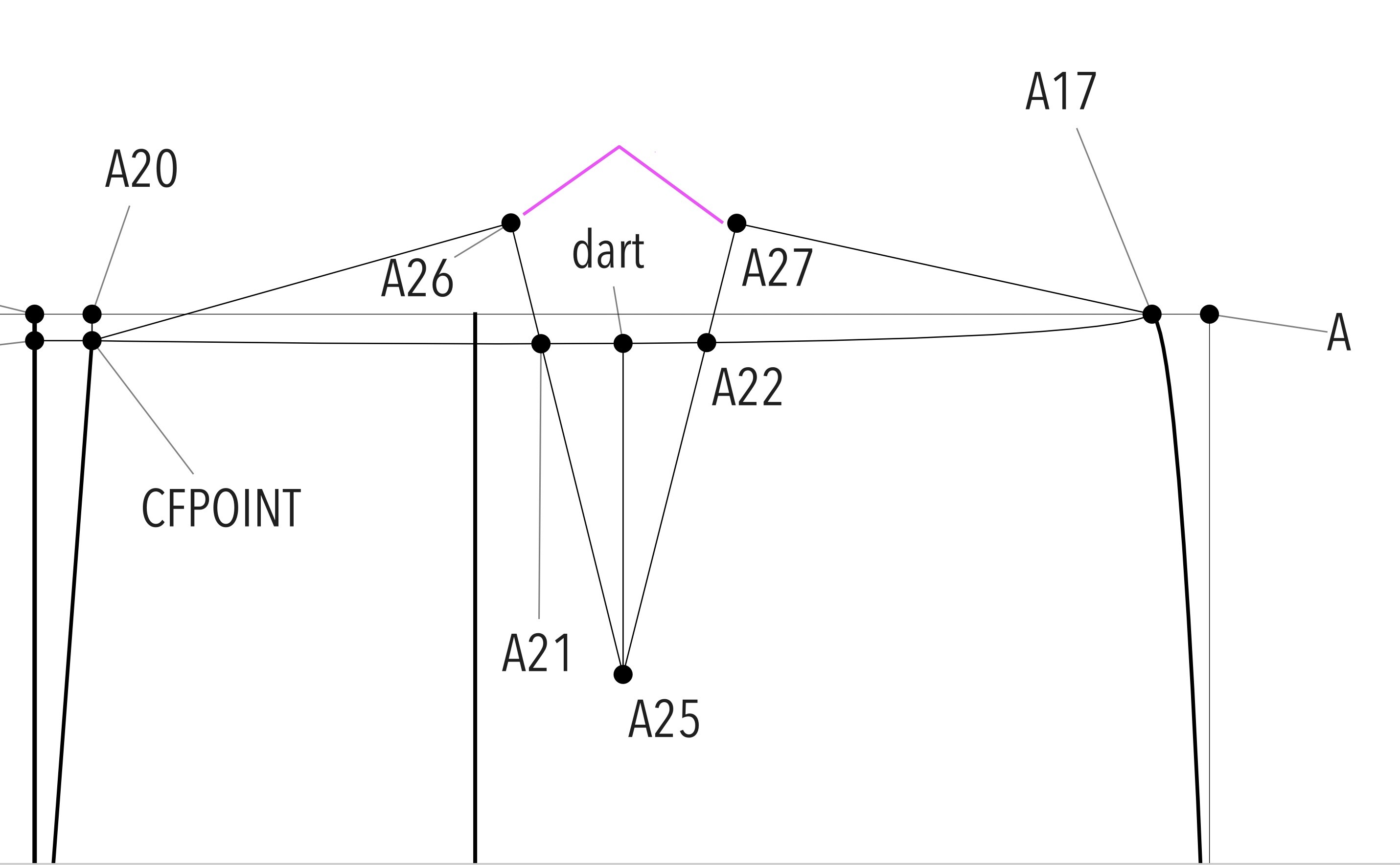 Wouldn’t all that excess fabric flapping around be cut off anyway? But if it will help you follow your directions as written, either use the Line tool, “Point - Intersect Lines,” & denote one line with CFPOINT & A26 & the other line with A17 & A27, or to get the midpoint to be the exact same length as the sides, use the “Point - On Line” tool, your first point will be A25 your second point dart & your length will be Line_A25_A26 (if that line doesn’t exist, use the Line tool to denote it.)