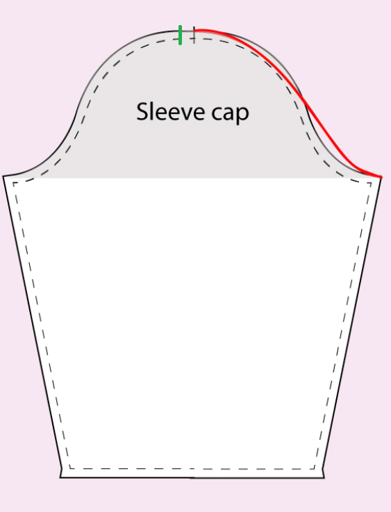 The few gathers between the front and back notches also serve to ‘cup’ the sleeve head over the shoulder and the norm for woven fabrics (depending on thickness and stiffness) is to have the sleeve cap curve 2.5cm (1") longer than the combined front and back armhole measurement.