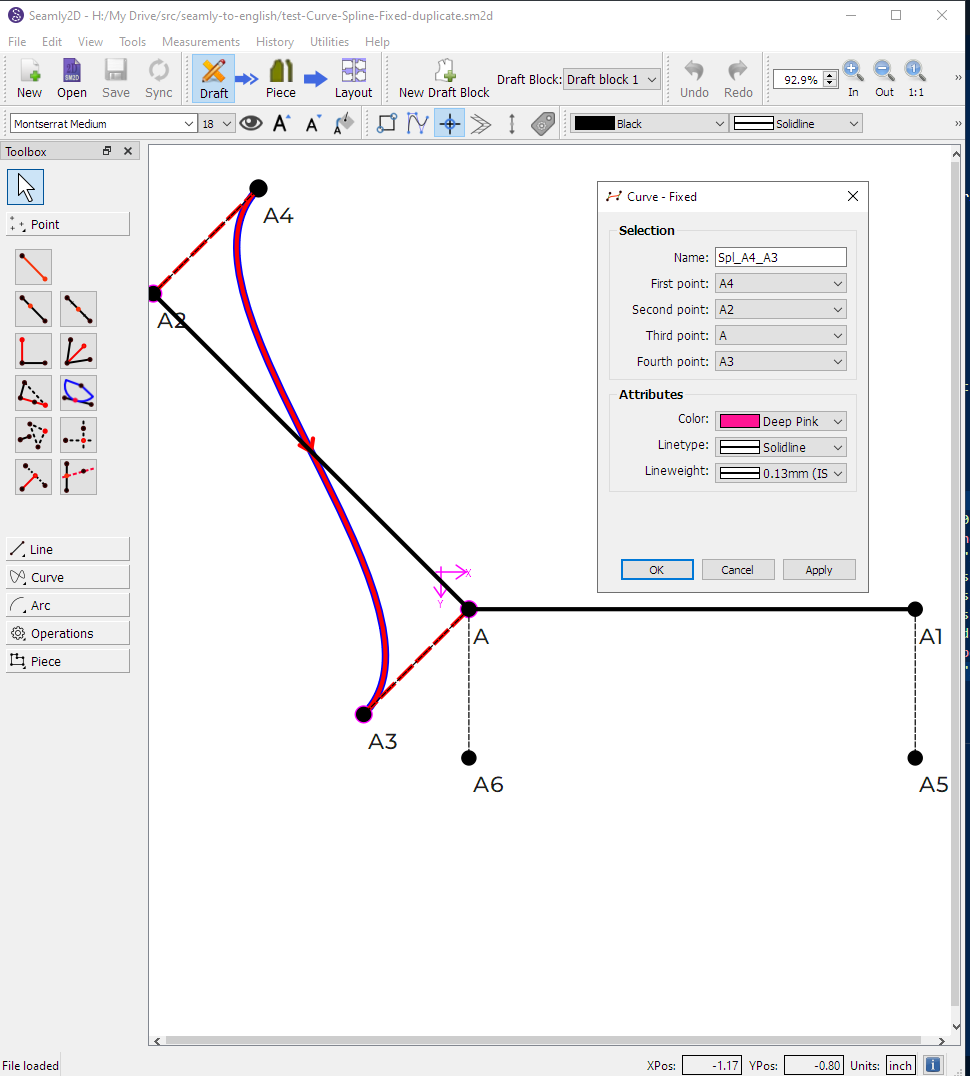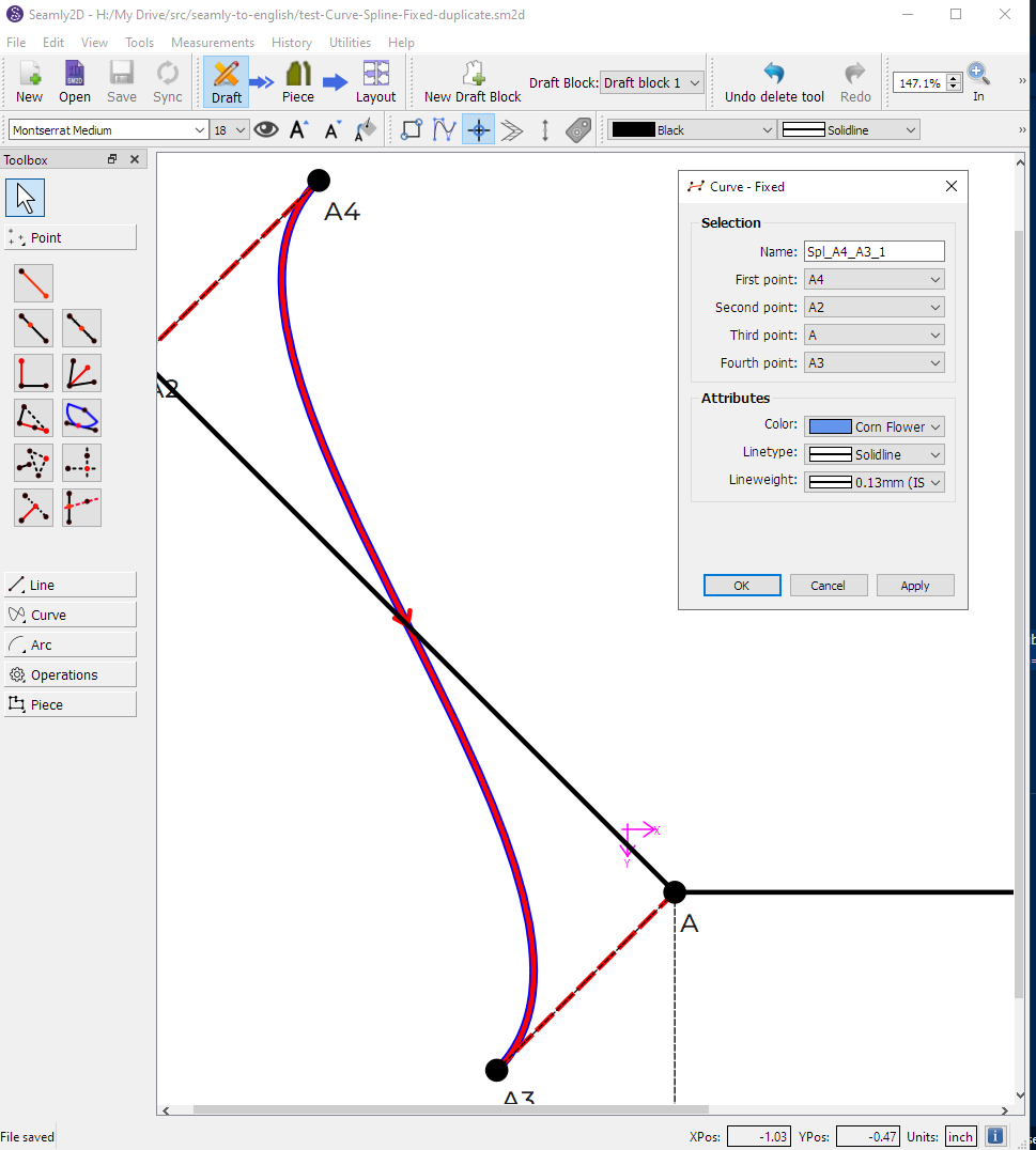 In Seamly v2-5-2024 on Windows 10: Duplicate attribute removed when updating a duplicate of a single segment bezier curve, Curve->Fixed. The duplicate’s object ID in the XML remains unique, but the spline name that is displayed in properties and is usable in formulas is no longer unique. I realize this is wouldn’t happen often but the consequences could be wonky.
