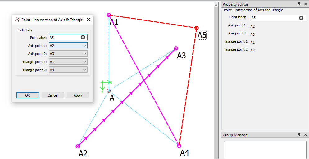 Susan suggested the XML tag “trianglePointOnAngle”, but this doesn’t follow the semantics of the other tool naming. I included an example of the tool to illustrate what it does… it produces a Point FROM the intersection of an Axis and the Sides of a right triangle. Again < Point > - < Intersection > < Axis & Triangle (sides) >. While the Angle of the hypotenuse is relevant, it is NOT directly provided by the user, and thus is NOT an input argument. I should also note that I changed the visual of the tool so the sides of the triangle are the maincolor (Red) in keeping with the normal visuals for the tool. The supportcolor (magenta) represents inputs the user provides, while the Red parts are the calculated result of those imputs.