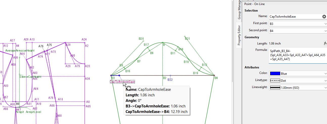 It depends on where you want to place the notches. If it’s on the sleeve cap that needs to match the notches on the armhole, then you place a point at the same distance on the sleeve cap curve from the underarm as it is placed on the armhole. So if the back bodice is on the left and the sleeve cap back is on the left and you drafted the sleeve cap curve from left to right, in 1 piece, then you’ll use the Point on Spline tool with a formula of the back armhole section from the notch to the underarm.