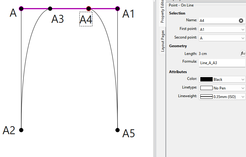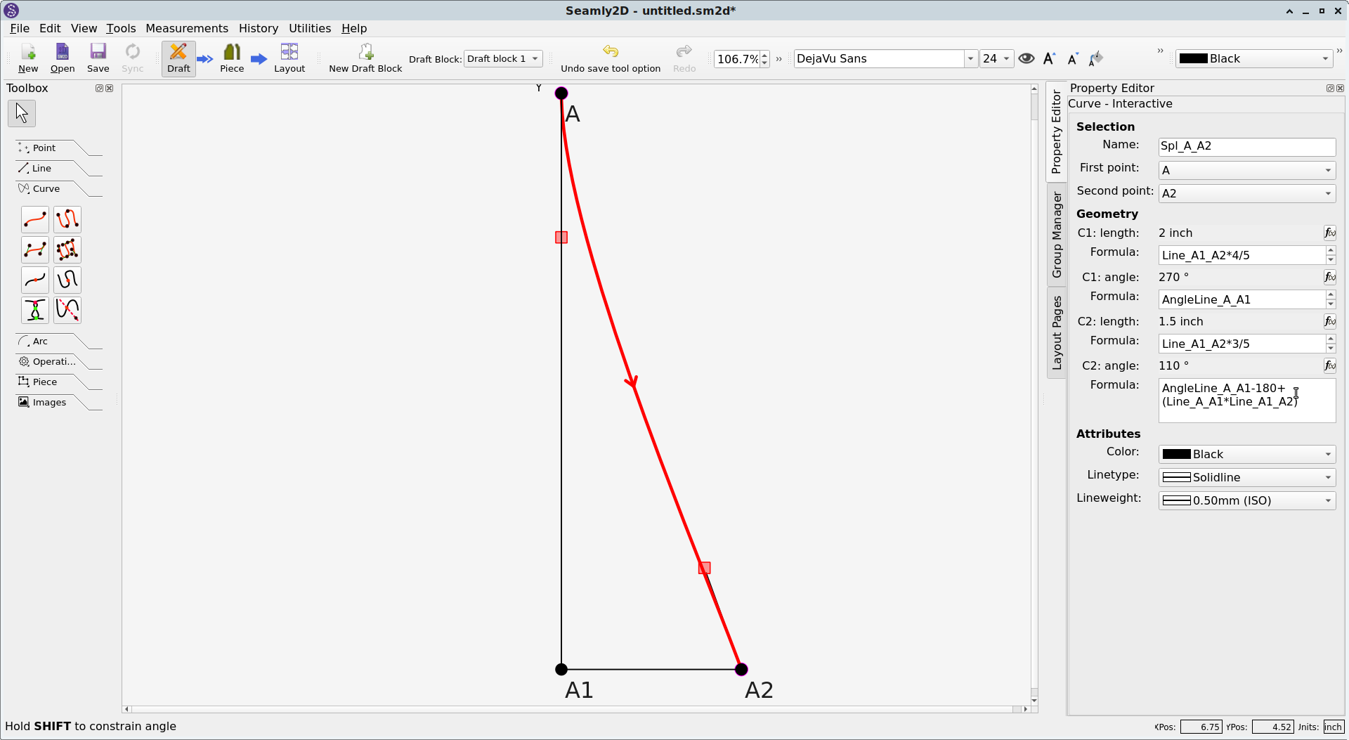 In context you won’t be using the same formulae I used, of course, but here you can see that I used the variable AngleLine_A_A1 for the angle of the first control point. Other variables include the measurements from the measurements file, & custom variables from the Variables dialog, but those are less likely to be apropos to creating bezier curves.