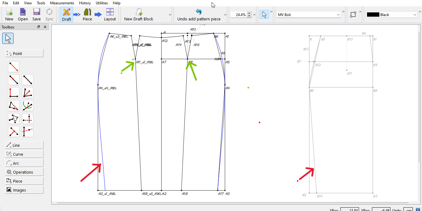 Also, how do i copy the exact curve i have on the highlighted draft piece to the other draft piece (red arrows). That’s I want to have the same side seam curve on both front and back piece. I tried copying the exact line length and angle for the curve but that didn’t result to an exact curve.