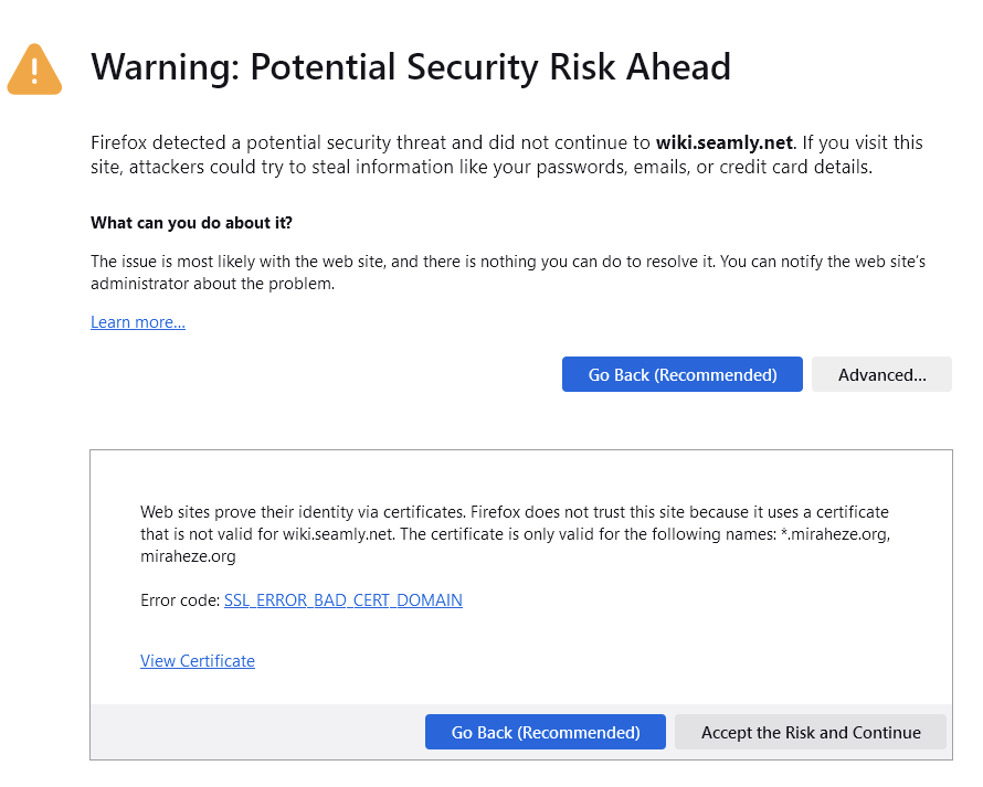 Going to the Wiki link in the ‘help’ toolbar menu upsets Firefox as the security certificate is valid for miraheze.org not wiki.seamly.net.